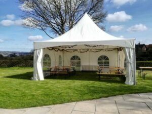 Detachable side walls with French windows and zippered entrance doors come as standard, providing the flexibility to use your pagoda tent as a fully enclosed, spacious party room or an open-sided exhibition marquee.